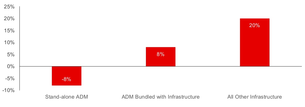 At the same time as spending on AI infrastructure – data processing and storage – has progressed at a rapid pace, there has been a slowdown in spend on Indian IT services over the last year. This points to spend on AI buildout consuming budgets, leaving smaller slices of the pie for IT Services. Even the hyperscalers, with their near limitless budgets, have cut IT services spends as they have grown their substantial AI infrastructure capex. Figure 4 reflects this disparity in spend for stand-alone application development and maintenance services versus infrastructure spend globally.