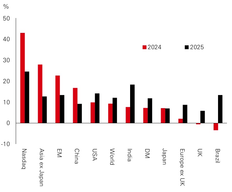 Up to now, the US has dominated the AI revolution, benefiting from deep capital markets, first-mover advantages, and robust ecosystems. Massive profitability of US tech firms has also supported investment in the technology. As of 2024, Nasdaq profits were four times the global average. However, that gap is now narrowing and brings regional broadening into consideration as part of the next stage of the investment cycle.