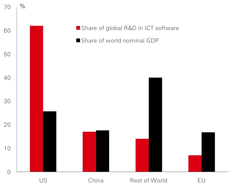 Since the global financial crisis, Europe’s annual growth rate has averaged only 1 per cent, largely due to a substantial productivity gap relative to the United States. This has resulted in an underperformance of about 1.2 per cent growth per year since the mid-1990s. A key factor is the lack of investment in research and development (R&D). The eurozone's share of global R&D in information and communication technology (ICT) software is under 10 per cent, well below the 60 per cent-plus for the US and notably lower than the EU’s share in global nominal GDP. Moreover, the EU’s budget is only around 1 per cent of GDP, much of which is spent in areas other than investment. Accessing funding for investment is also often a complex process. Public spending on investment is largely conducted at the national level. This means spending is not well coordinated and not necessarily allocated towards the EU’s strategic priorities.