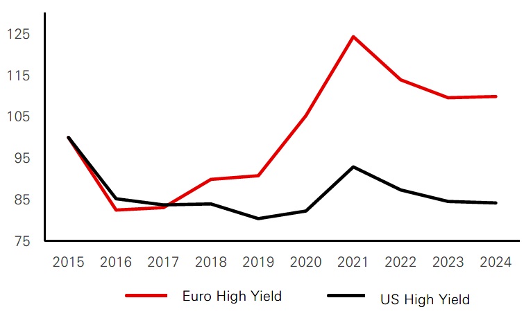 The European credit market has seen significant improvement in diversity over the past decade. The face value of the ICE BofA Euro Investment Grade Corporate Index has nearly doubled, while the number of issuers has increased by over 50 per cent, highlighting the market's dynamism for both issuers and investors. Positive trends are also evident in the HY segment, where the face value has risen by 25 per cent and the number of issuers has grown by 10 per cent. This contrasts with the US market, where the number of HY issuers has tended to decline. Today, the Euro credit market benefits from much better sector diversification, with no single sector dominating. This marks a significant shift from the early 2000s, when the TMT (technology, media, and telecommunications) sector was predominant in the high-yield space, or the Global Financial Crisis period, when the banking sector dominated the investment-grade space. This enhanced sectoral diversity provides the market with greater resilience, reducing its vulnerability to systemic risks arising from potential downturns in any single sector.