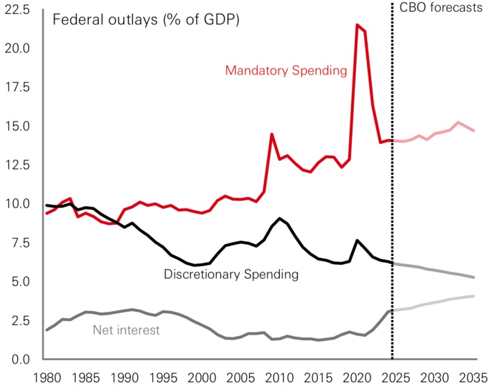 The US federal deficit is driven by rising mandatory spending and net interest payments, alongside low tax rates. Demographic shifts, such as an increasing old-age dependency ratio, exacerbate fiscal challenges.